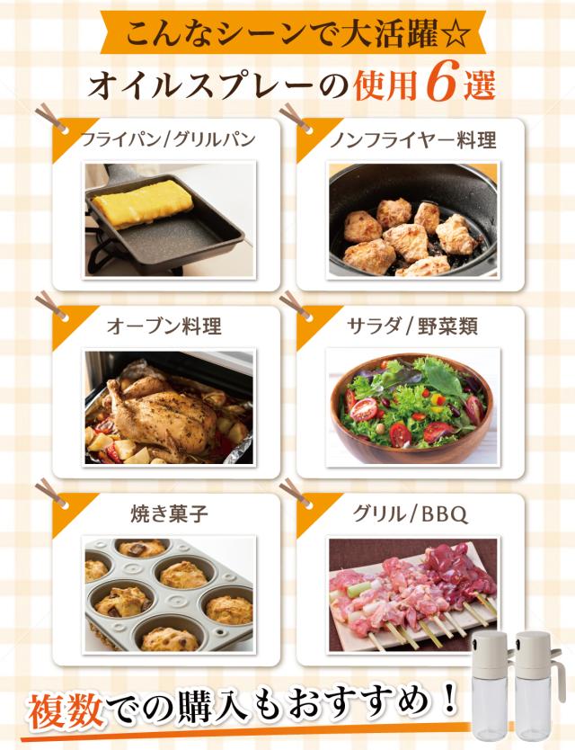 - 家に100均の一滴ずつ出せるオイルポンプ?あるんですが、普段はいいんです。ただ、個数があるものに1個に一滴ずつ落としてたら、結構油使ってるんじゃ……ってなってカロリーが気になってしまって、こちらのオイルスプレーを購入しました。同じ3回でも1個ずつに3回より、全体に3回のほうがいいはずです!スプレーの範囲を把握できずに、少し外してしまいますが便利です。