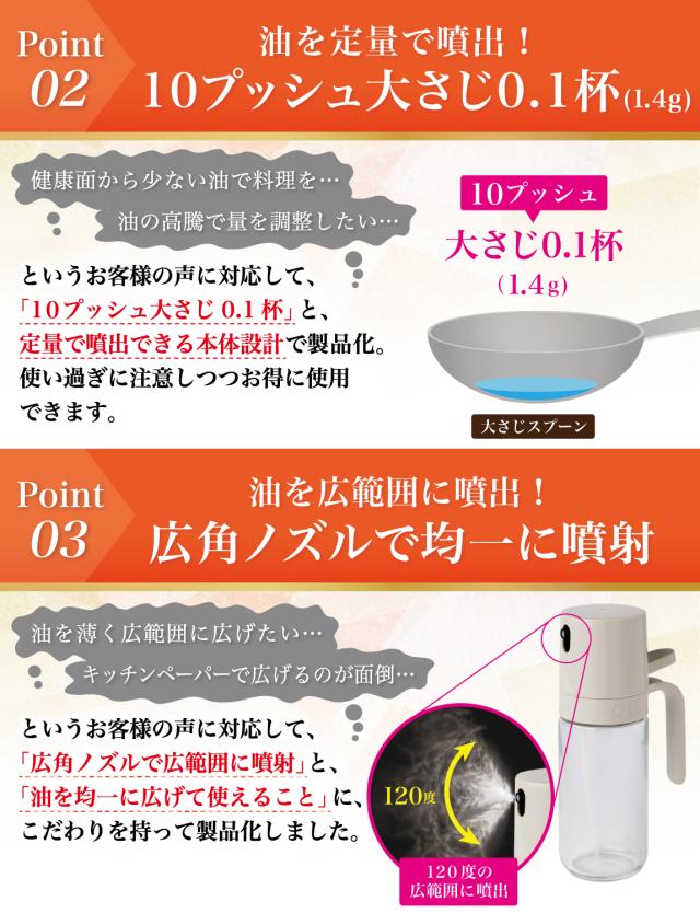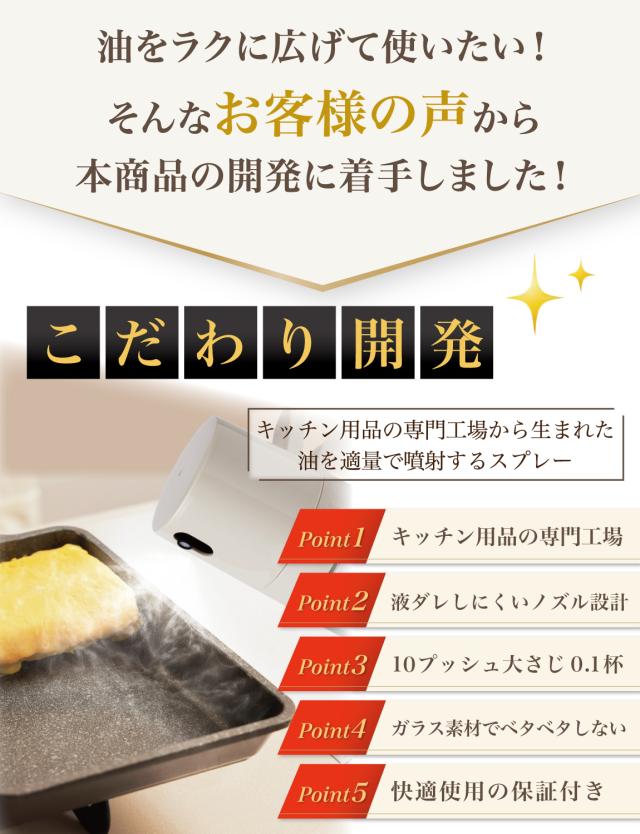 「適量のオイルをミスト状に霧化させて使いたい」「油引きのため均一にスプレーしたい」という