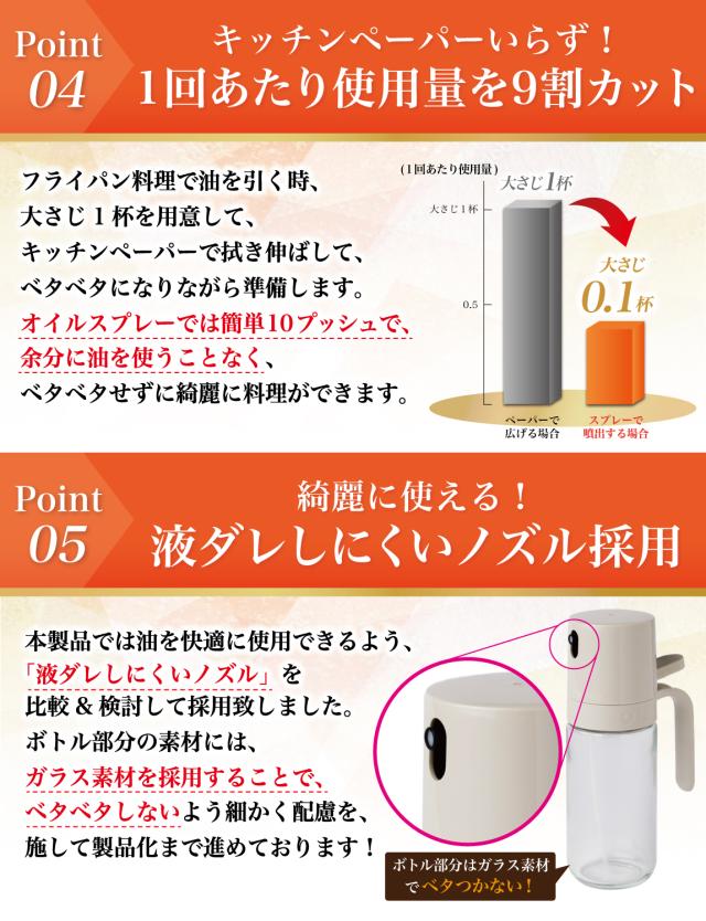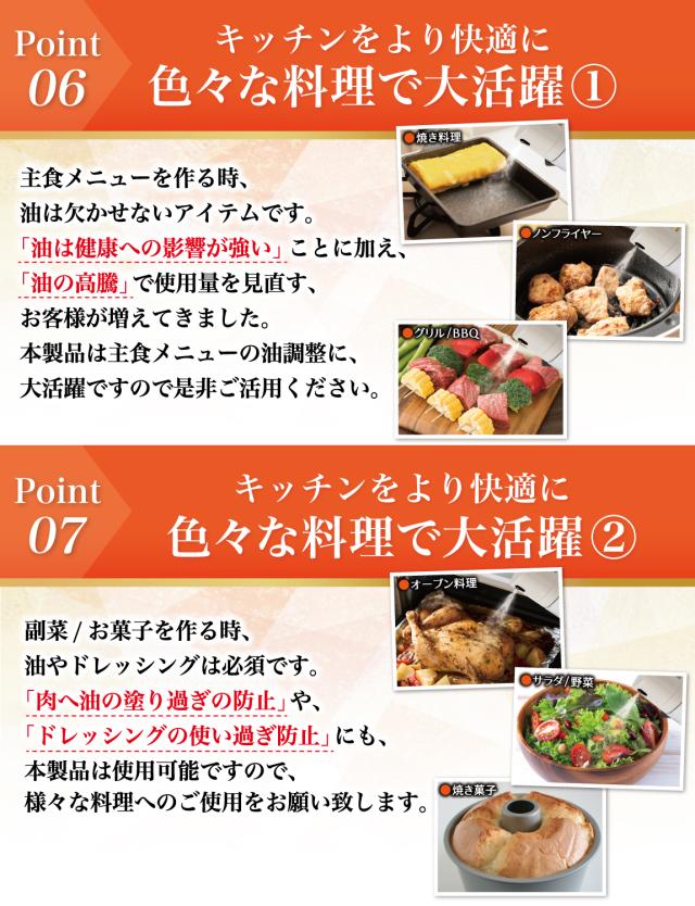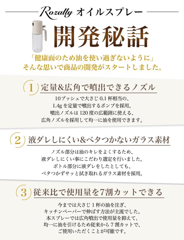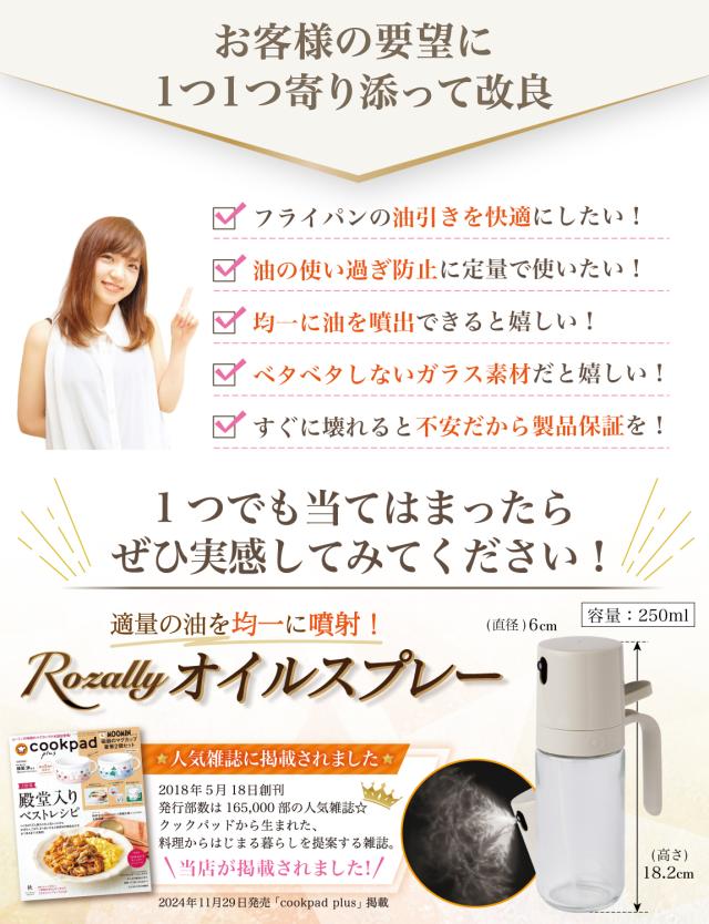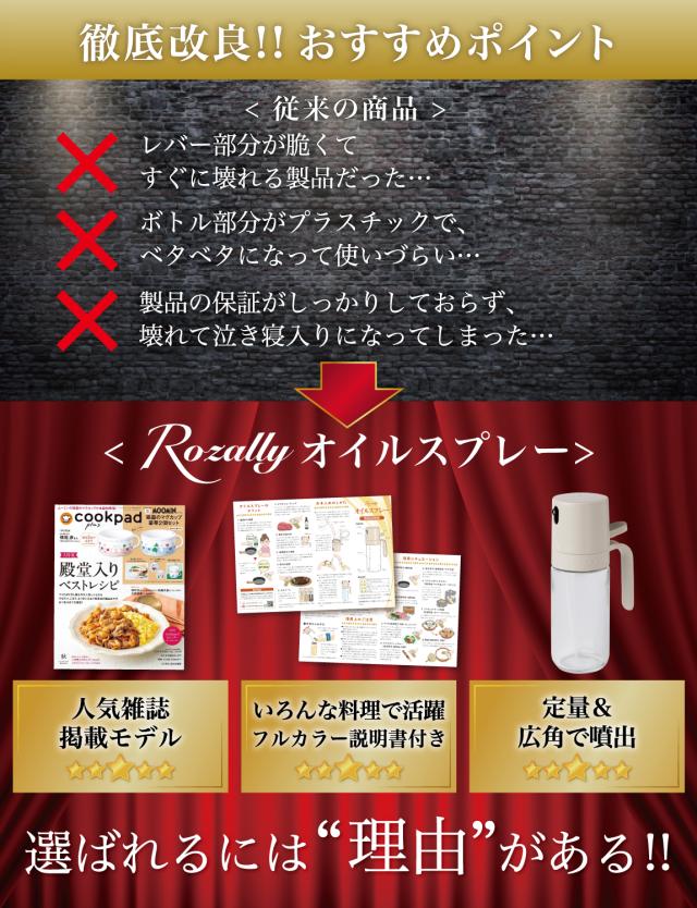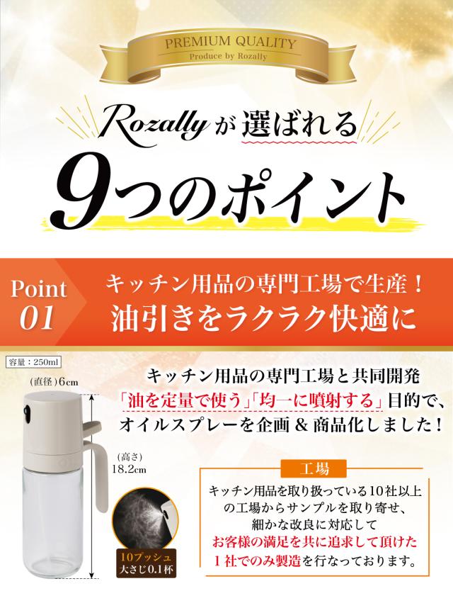 様々なメーカーから キッチン 用品として ”ノンフライヤーオイルスプレー ”や” オイルスプレーボトル ”など ボトル型のオイル用品 が日本製/中国製など様々に販売されていますが、 Rozallyの オイルスプレー は”こだわり”が一味違います。 「液だれ防止の設計」で汚さずに使え、 「1プッシュ大さじ0.1杯」と定量でオリーブオイルなど使うことができます。 製菓用や料理用に大活躍すると好評のアイテムです。 |