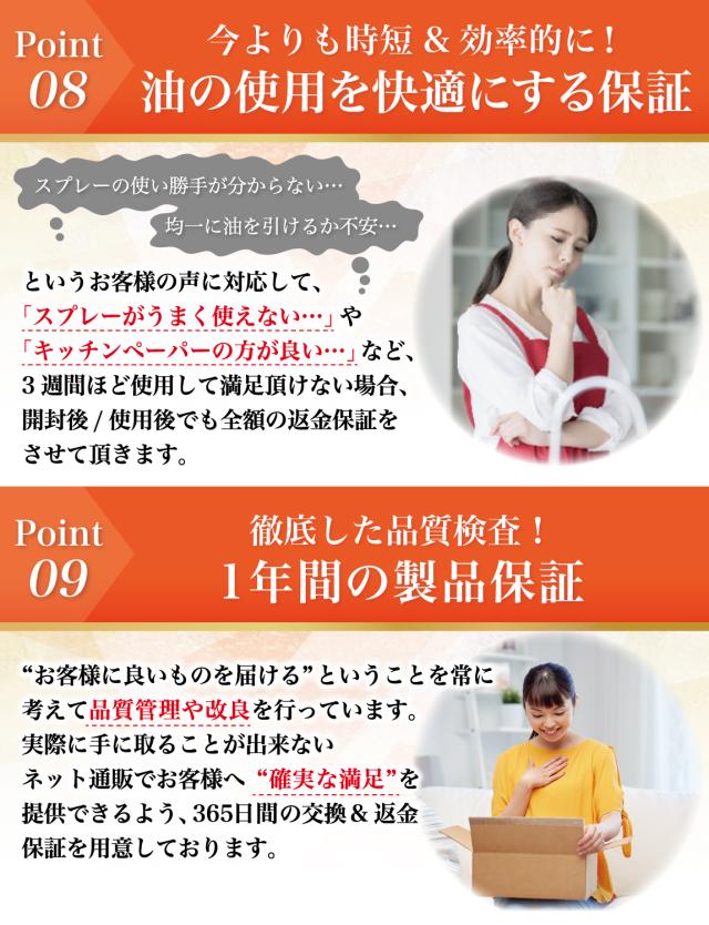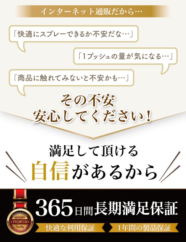 Rozally オイルスプレー は品質にこだわり、工場と交渉をおこなってガラスの素材選定から進めています。 出荷前の検品などは十分に行わせて頂いているのですが、 輸送中に破損や汚れの付着など稀に発生してしまうケースがあります。 不具合などが発生してしまった場合でも、 製品には1年間の長期保証を付属させて頂いておりますので、 すぐに交換品の手配をさせて頂きます。 また本製品には効果を実感して頂くことを最優先に考え、 「2週間ほど使用しても快適さが全く実感できなかった」という場合に、 ”開封後”でも”使用済み”でも全額の返金保証を付属させて頂いております。 |