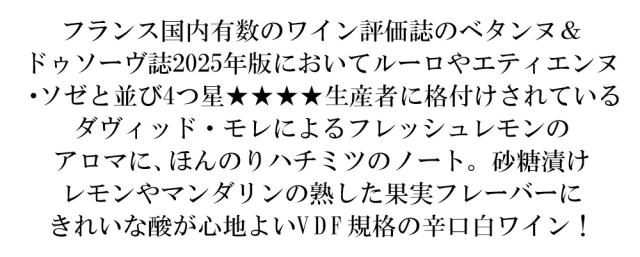 フランス国内有数のワイン評価誌のベタンヌ& ドゥソーヴ誌2025年版においてルーロやエティエンヌ ・ソゼと並び4つ星★★★★生産者に格付けされている ダヴィッド・モレによるフレッシュレモンの アロマに、ほんのりハチミツのノート。砂糖漬け レモンやマンダリンの熟した果実フレーバーに きれいな酸が心地よいVDF規格の辛口白ワイン!