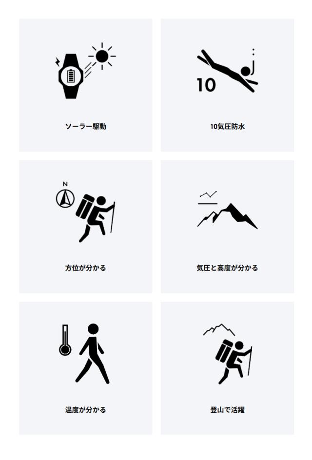 アウトドア活動に役立つトリプルセンサー(方位、気圧/高度、温度計測)とタフソーラーを搭載しています。