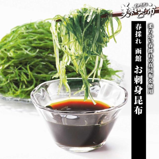 津軽海峡から噴火湾にかけての函館沿岸で採れる真昆布は、上品で清澄な出汁がとれると言われ、日本料理には欠かせないものとして食されています。その函館近郊の漁師町で毎年春に昆布を干す風景は、春の風物詩でもあり、水揚げされる春採れ昆布は、歯応えがありながらも、柔らかくまろやかな味わいなのが特徴です。本品は、塩蔵製法で仕上げ、水戻し済みなのでそのまま「つるっ」と美味しくお刺身で。1袋に100g(2?3人前)も入っているので、お刺身以外のアレンジ料理も存分にお楽しみいただけます。ぜひお試しください。