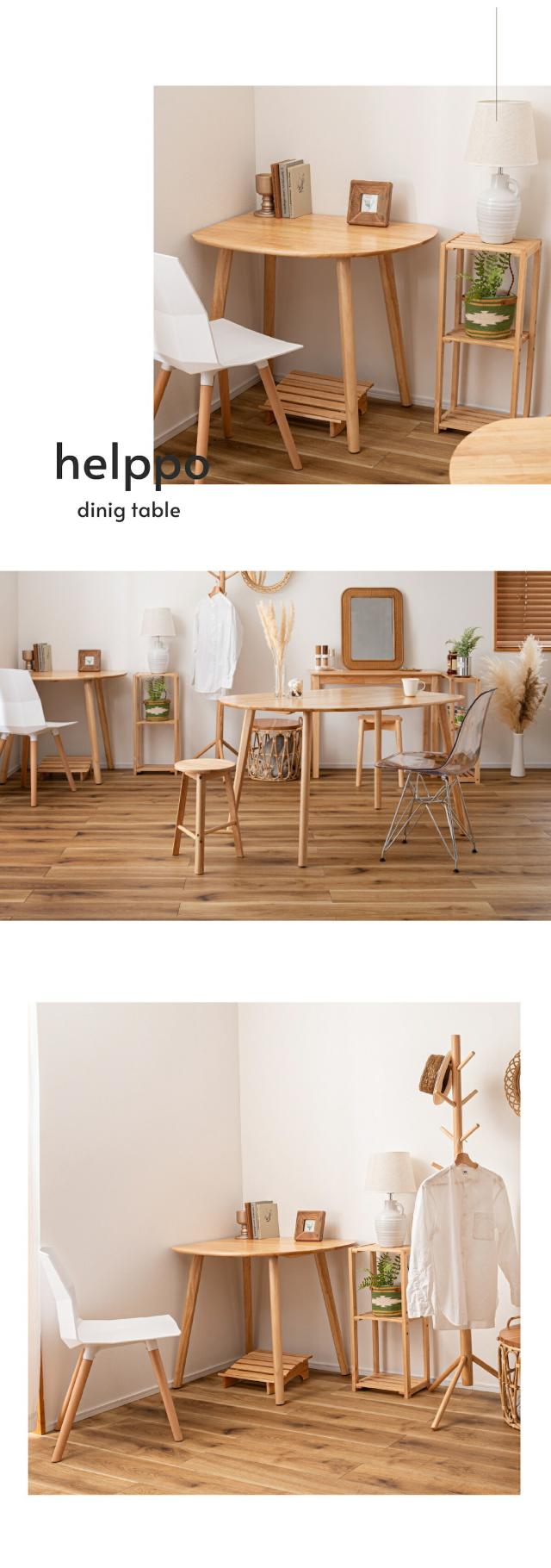 天然木のぬくもりを感じる北欧風デザインの「helppo」シリーズより、個性的なフォルムのダイニングテーブルが登場しました。木目を活かしたデザインと、エッジを極力落とした丸みのあるフォルムが優しい印象を与えます。