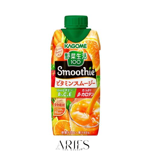 カゴメ 野菜生活100Smoothie ビタミンスムージー330mlは、1/2日分の野菜※1を使用し、1日分※2のビタミンB2、C、Eと食物繊維がしっかり摂れる、濃厚スムージー。砂糖不使用で爽やかでジューシーなオレンジのおいしさです。野菜の栄養※3で元気をサポート!※1厚生労働省推進・健康日本21の目標値(1日350g)の約1/2である野菜175g分〇野菜飲料は原料野菜の全成分を含むものではありませんが、不足しがちな野菜を補うためにお役立てください。 ※2栄養素等表示基準値(2015)に基づく ※3β—カロテン