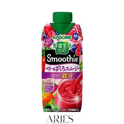カゴメ 野菜生活100 Smoothie ベリー&ざくろスムージー330mlは、1/2日分の野菜(175g分)を使用※1し、1日分の鉄分※2としっかり食物繊維が摂れます。砂糖、不使用です。ベリーとざくろの芳醇で甘酸っぱいおいしさの濃厚スムージーです。※1厚生労働省推進・健康日本21の目標値(1日350g)の1/2である野菜175g分 14種の野菜と5種類の果実※2栄養素等表示基準値(2015)に基づく。野菜飲料は原料野菜の全成分を含むものではありませんが、不足しがちな野菜を補うためにお役立てください。