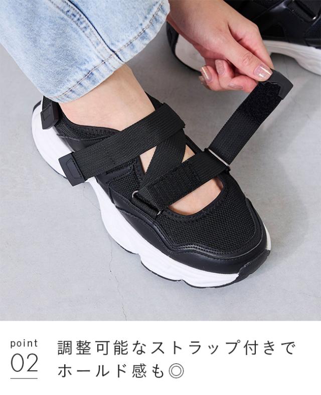 近年よく見るスニーカーライクな厚底ソールが特徴的な1足。一般的なスニーカーと違って甲と踵が開いているので、サンダル感覚でも履けちゃいます!つま先も隠れているので、ネイルしていない...となっても大丈夫です♪