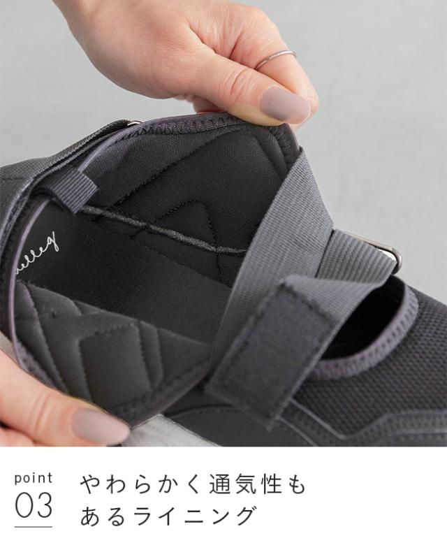 甲にもかかとにもストラップ付きのため、自分好みの履き心地に調整可能!ホールド感もあり、歩きやすさを叶えます。