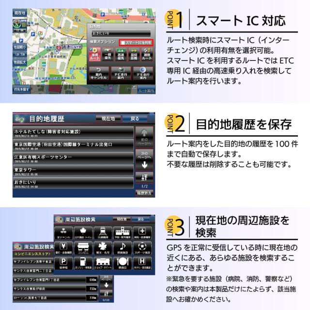 | スマートICに対応 | ルート検索時にスマートIC(インターチェンジ)の利用有無を選択可能。スマートICを利用するルートではETC専用IC経由の高速乗り入れを検索してルート案内を行います。 |