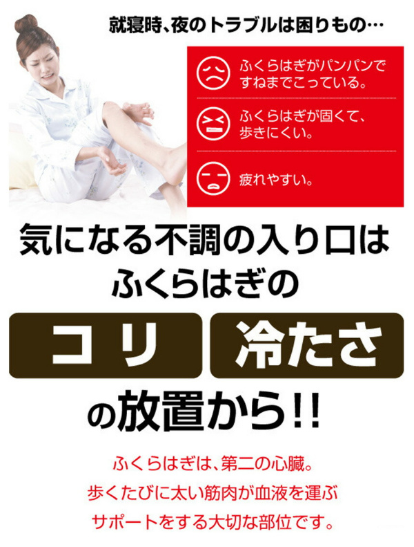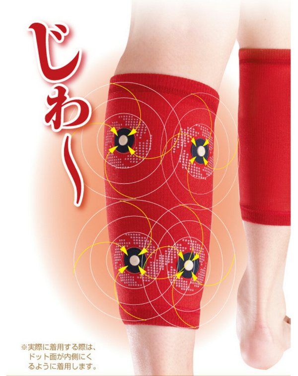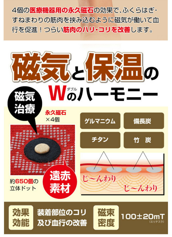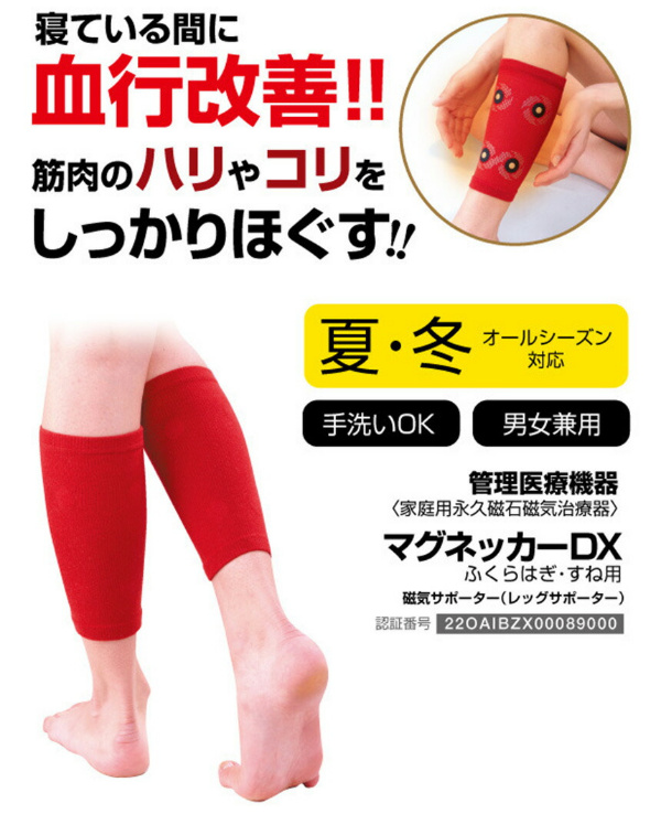 ■寝ている間にふくらはぎの血行を改善し、筋肉のハリやコリを芯からほぐして治療する医療機器サポーターです。■ゲルマニウム、備長炭、チタン、竹炭など、遠赤外線素材のドットをプリントしたソフトサポーターが、冷えたふくらはぎを温かく包み込みます。伸縮性、弾力性、保湿性に優れた材質を採用しているため、若い方からシニアまで安心してお使いいただけます。■4個の医療機器用の永久磁石の効果で、ふくらはぎを挟み込むように磁気が働いて、血行を促進、つらい筋肉のハリ・コリを治療します。気になる部位に、磁石が当たるように、ご自由にずらしてご使用ください。■夏の冷房が強いオフィスやご自宅で、冷房対策としてもご好評をいただいています。筋肉のコリ、血行不順が原因の疲れも、翌朝スッキリ。■洗濯をしても効果は変わりません。清潔な状態で、何回でも、繰り返しご使用いただけます。