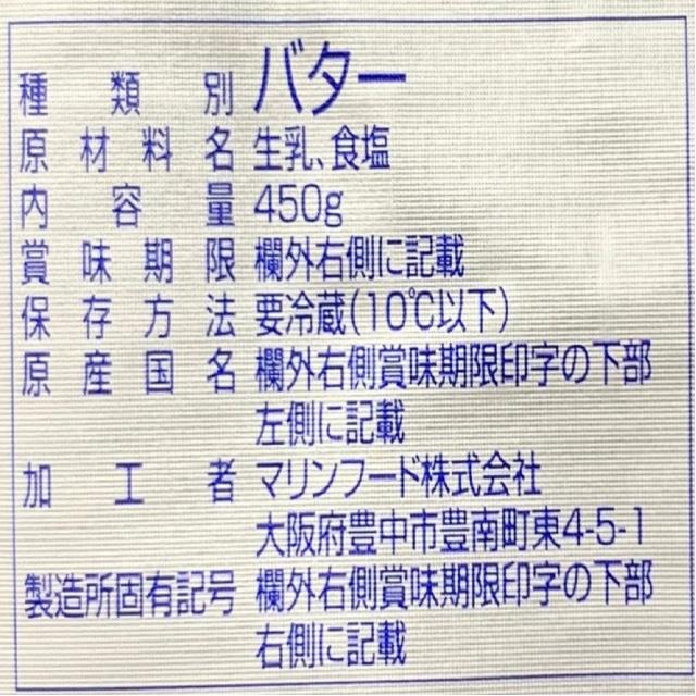 商品名 [冷蔵]マリンフード ミルクを食べる乳酪バター450g×3個 容量 450g×3個 原材料名 生乳、食塩 アレルギー特定原材料 乳 賞味期限 商品の発送時点で、30日以上あるものをお届けいたします 保存方法 要冷蔵(10℃以下)