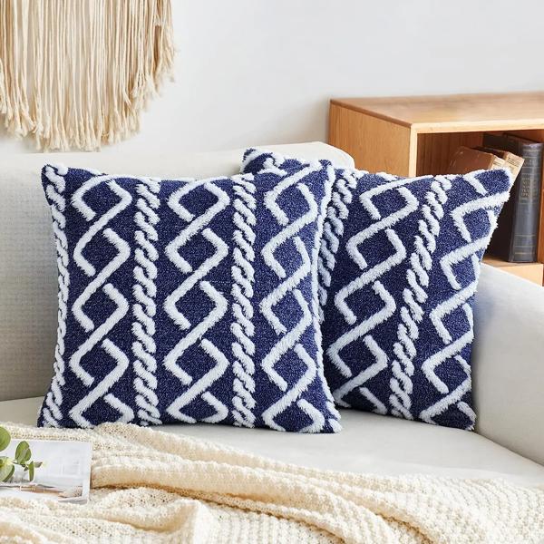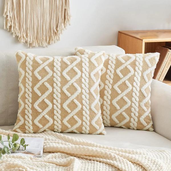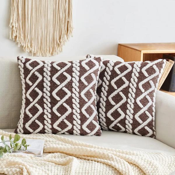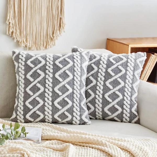 装飾的な人工ウール枕ケース、柔らかく、短いぬいぐるみ、正方形のパターン、クッションカバー、色マッチング、モダンな装飾、1個