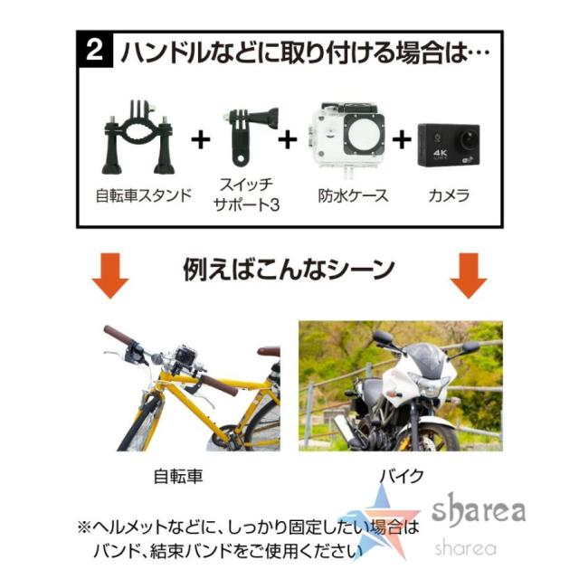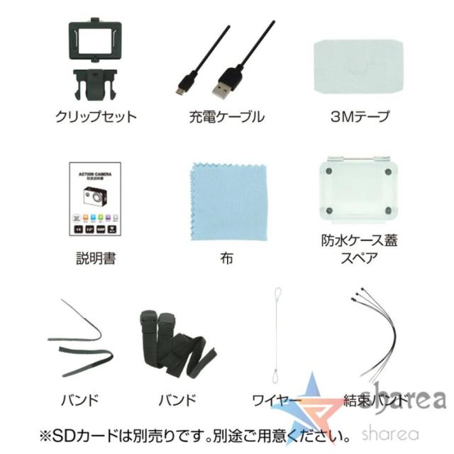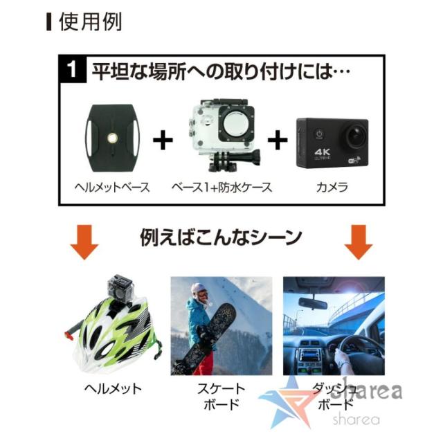 AC-01には豊富な付属品セットが含まれています。これにより、さまざまな撮影シーンに対応するための必要なアイテムが一式揃っています。組み合わせてバイク?自転車?スノーボード?サーフボード?ヘルメットに装着可能なウェアラブルカメラです。
