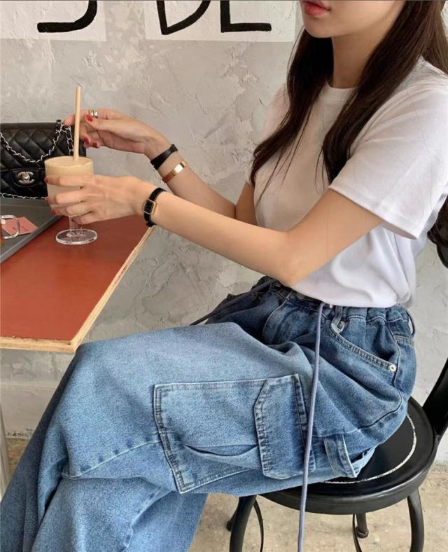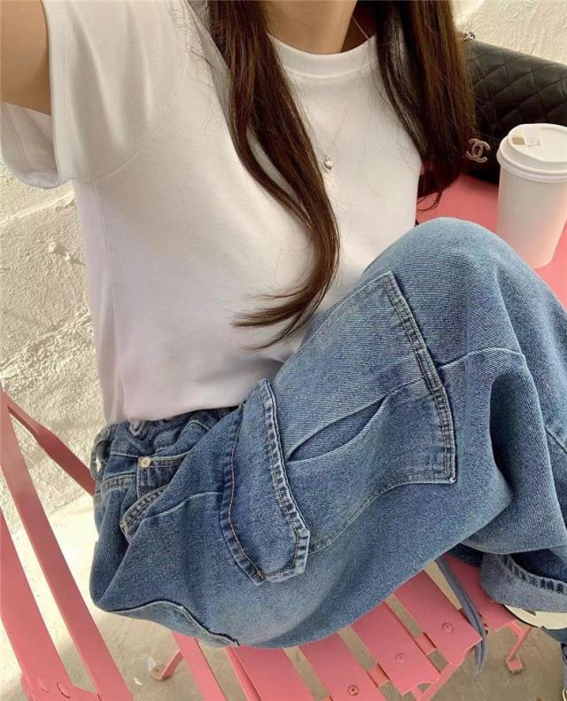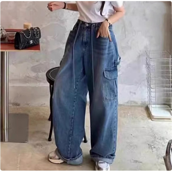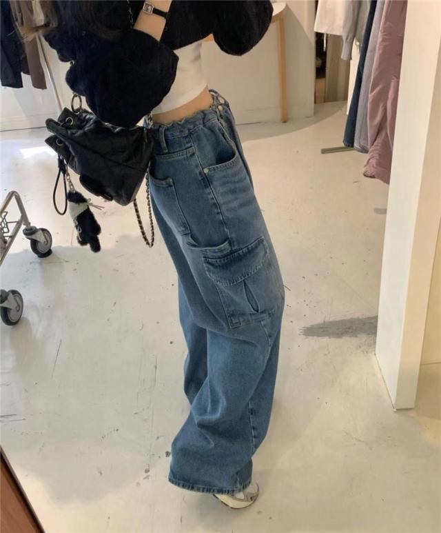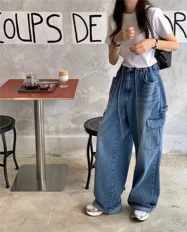 パンツ デニム レディース カーゴ ワイドパンツ 大きいポケット ジーンズ ウォッシュ ユーズド風 自然に体型カバー すっきりとしたデザイン 着やせ