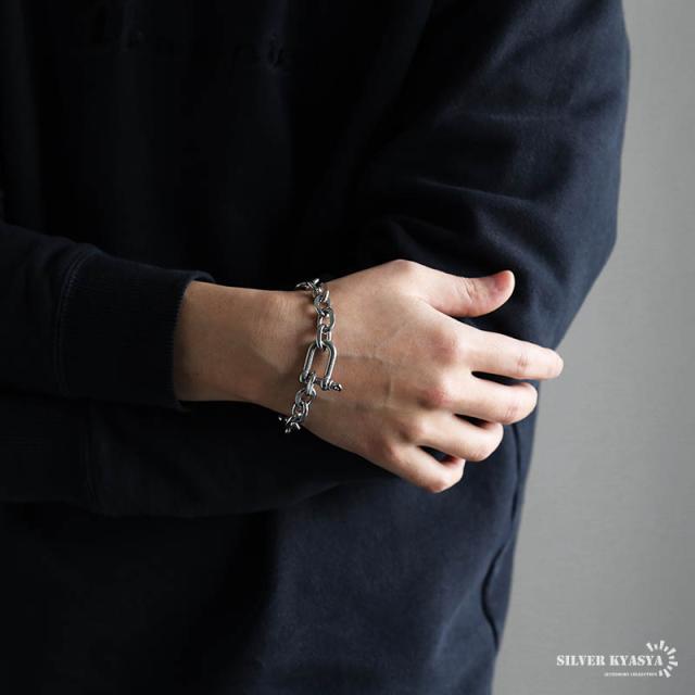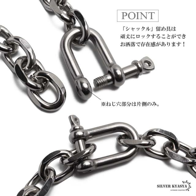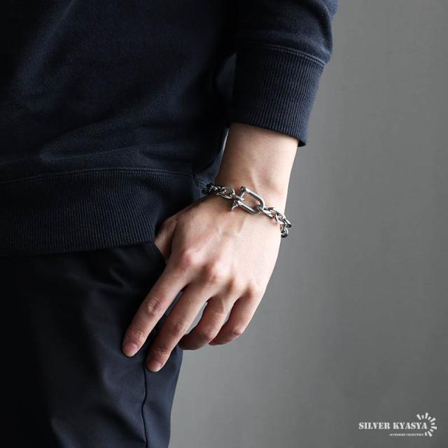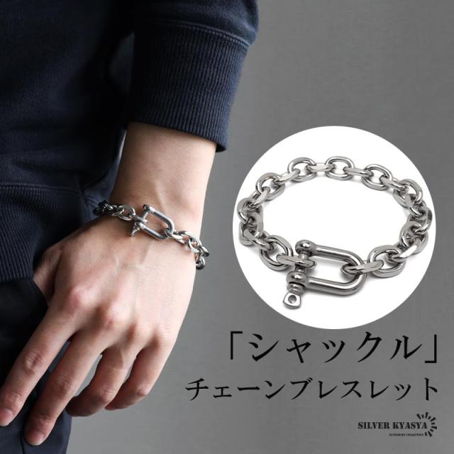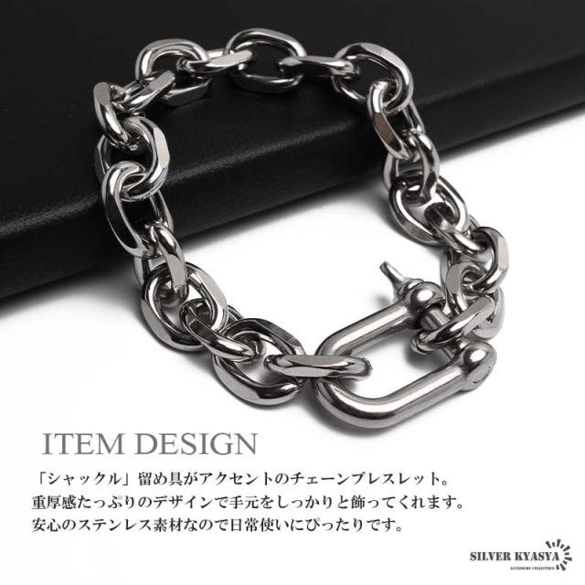 「シャックル」留め具がアクセントのチェーンブレスレット。重厚感たっぷりのデザインで手元をしっかりと飾ってくれます。安心のステンレス素材なので日常使いにぴったりです。