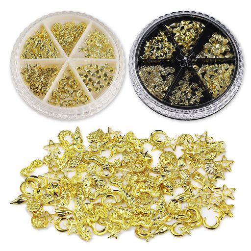 レジン 封入パーツ メタル 夏 海 マリンモチーフ シェル 星月 ゴールド ネイル用 ミニチャーム デコ素材 アソート 12種300個 (マリーン・星月)