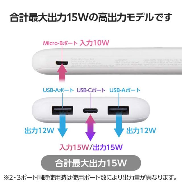●USB-Aポート×2、USBType-C(TM)ポート×1の3ポートから出力可能。USB-Aポートからは最大12W、USBType-Cポートからは最大15Wで充電できます。