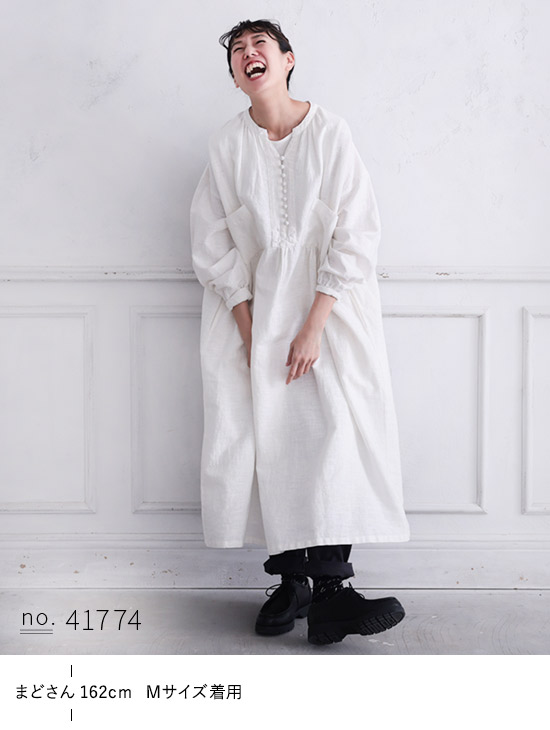O.W.N 遊びが詰まった白いワンピース レディース ロング 長袖 キーネック スキッパー風 フレア Aライン 麻 リネン