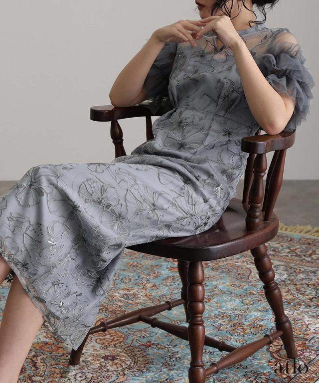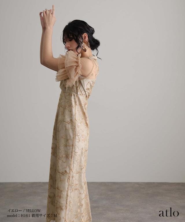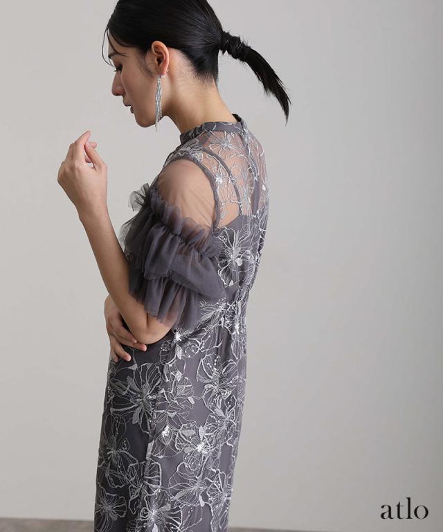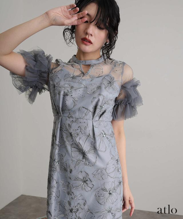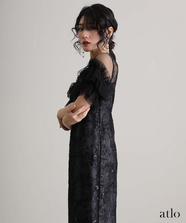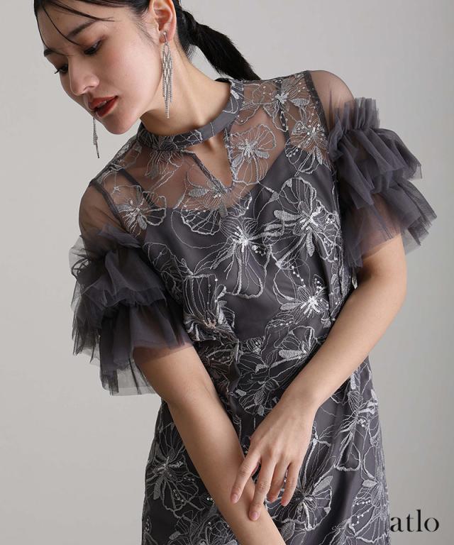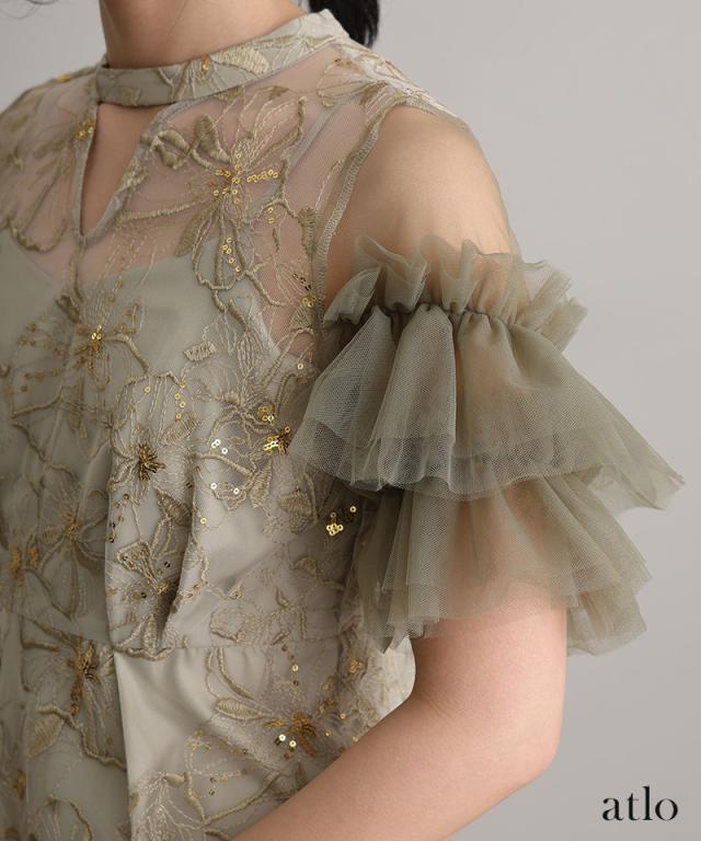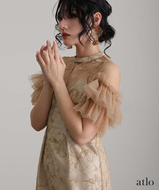 軽やかなチュールフリル袖とオフショル風のデザインで、華やかさを演出。