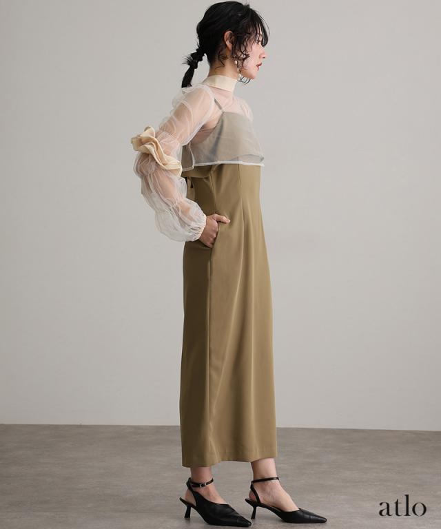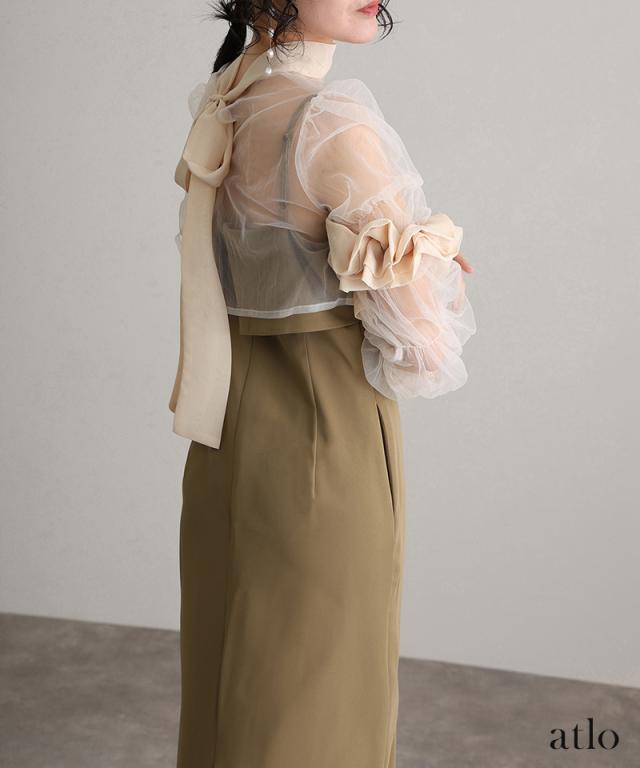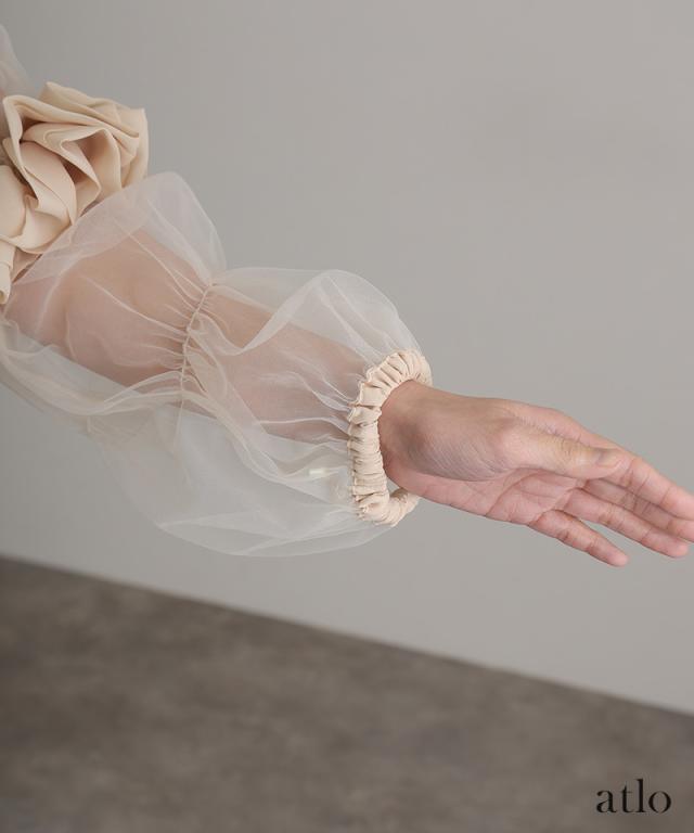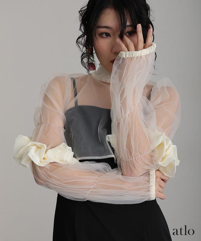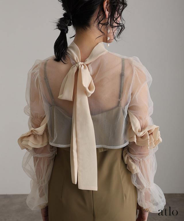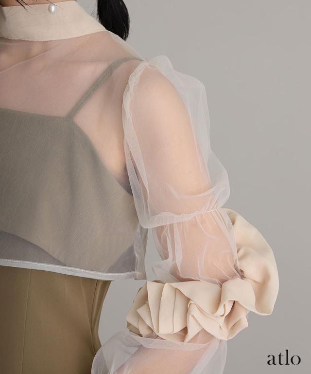 袖のボリュームフリルとスタンドカラーが、シルエットにメリハリを与えてくれます。