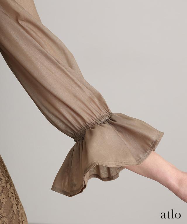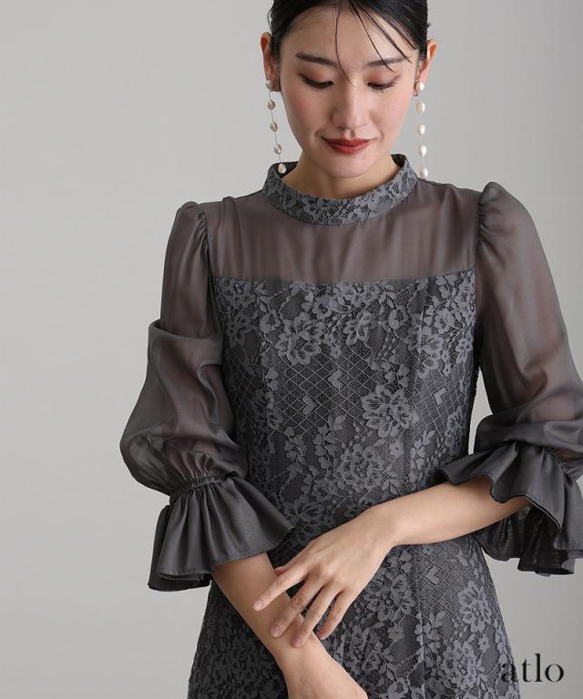デコルテから袖の透け感で重くなりすぎず、柔らかい印象に。