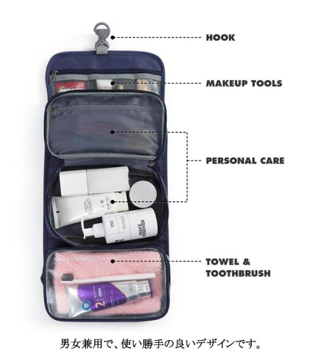 | コスメや洗面具など細々したアイテムを一つのポーチにまとめる事ができます。 吊り下げ用のフックが付属しており、壁に掛けての使用が可能です。 男女兼用で、使い勝手の良いデザインです。 旅行やジム、キャンプ、出張など、様々なシーンで幅広く使用できます。 | |