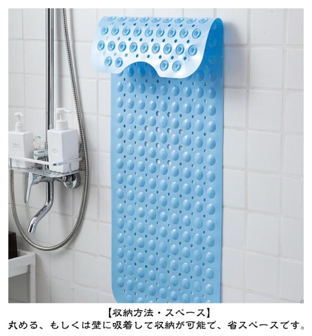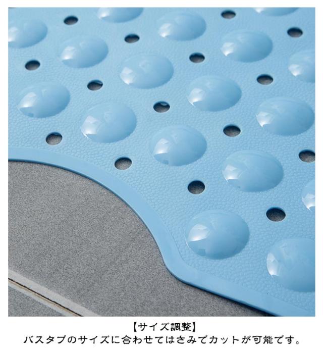 | お風呂での転倒防止に 滑り止めマット 100×40cm ハサミでカット可能 滑りやすいバスタブ、浴槽の底に敷くことにより転倒を防止する、お風呂の滑り止めマット。 バスタブのみでなく、洗い場でも使用が可能なので、より安全です。(浴槽・洗い場でのご使用の際、タイルや吸盤が貼りつかないタイプの床の場合はお使いいただけませんのでご了承ください) 【滑り止めマットの安全加工】 突起加工:200個の突起が適度の刺激で足裏やお尻に心地よさを演出 排水穴加工:お湯を抜いた時にマット表面に水分が残らないよう排水穴から素早く排水します。 滑り止め加工:特殊な凹凸加工が滑り止め効果を生み出しています。 【収納方法・スペース】 丸める、もしくは壁に吸着して収納が可能で、省スペースです。 【使用場所】 バスタブ及び洗い場 【サイズ調整】 バスタブのサイズに合わせてはさみでカットが可能です。 【ご使用上の注意点】 給湯するより先に設置すると給湯中にマットが浮かび上がる場合があります。 給湯後に設置することをおすすめ致します。 | |