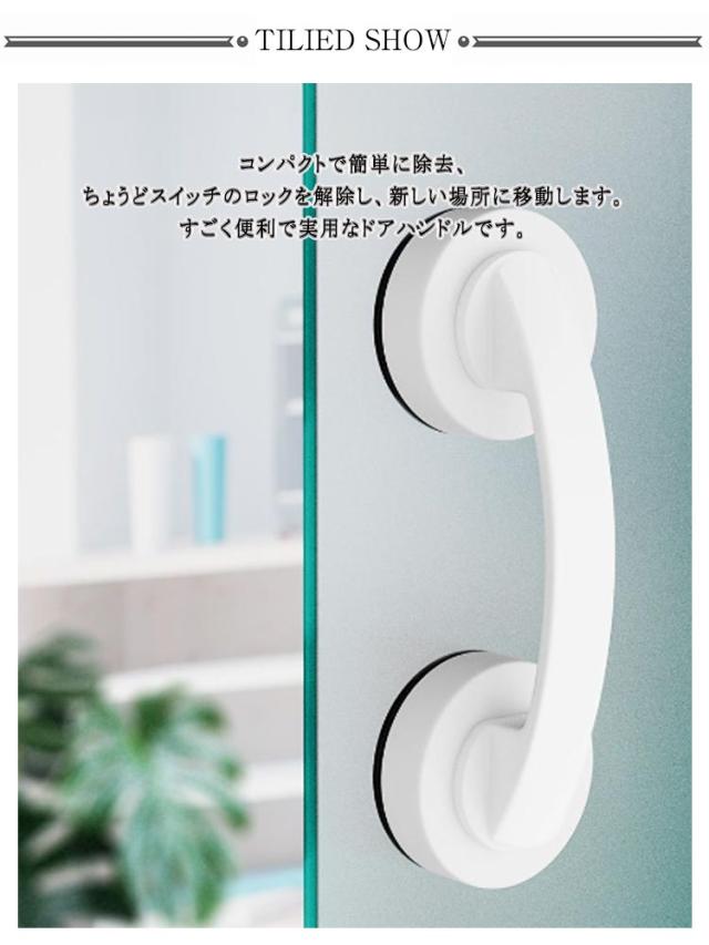 | 重い引き戸や大きな窓を簡単に開閉できる補助ハンドル。 強力吸盤でどこにでも設置できるから便利! 接着剤や工具は不要! あなたの家族にとってより安全です。 コンパクトで簡単に除去、ちょうどスイッチのロックを解除し、新しい場所に移動します。 すごく便利で実用なドアハンドルです。 取り付け手順: 1、取り付ける部分をタオルで拭きます。 2、吸盤から保護フィルムを?がしてください。 3、吸盤を壁に抑えて、時計回り360°回転してからロックします。 4、完成です。(しっかりと固定されているかを確認してください。) | |