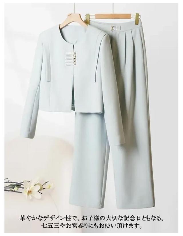 | ジャケットと腰高見えなワイドパンツの新鮮なセットアップ。 上下ともにほどよくゆとりのあるシルエットに仕上げられているのがポイント。 さっと羽織れるボタンタイプ。閉めて「きっちり」外して「ラフ」に着こなせます。 パンツはゆったりとしたストレートラインで脚長効果抜群、ハイウエストデザインでスタイルアップ! とろみ素材と洗練されたシルエットでこなれた大人顔になれる1枚。 卒園式や卒業式から、入園式や入学式はもちろん、参観日や学校行事にもお薦め。 華やかなデザイン性で、お子様の大切な記念日ともなる、七五三やお宮参りにもお使い頂けます。 | |