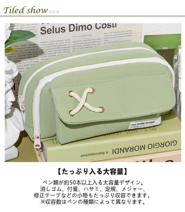 | 【たっぷり入る大容量】ペン類が約50本以上入る大容量デザイン。消しゴム、付箋、ハサミ、定規、メジャー、修正テープなどの小物もたっぷり収容できます。 ※収容数はペンの種類によって異なります。 【ペンが探しやすい】メインファスナーがぐるりと大きく開くので、必要なものをスマートに取り出すことができ、ファスナーには引き手がついているので開閉しやすくなっています。 【小物を分類できるメッシュポケット付き】ふせんや定規などを分けて収納できるポケットがついています。 筆記具などと分けて収容できるので、小物が探しやすく汚れにくいので安心です。 【ペンケース以外の用途にも便利】 化粧ポーチとしても有効活用可能。いつも携帯するUSBメモリやスマートフォンの携帯充電器の機器類にも。常備薬や目薬、塗り薬などちょっとした小物入れにも。 | |