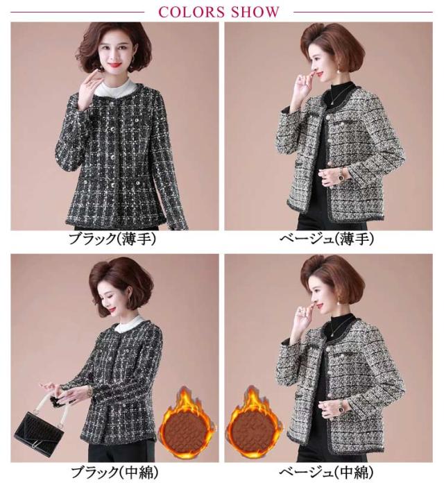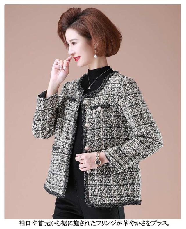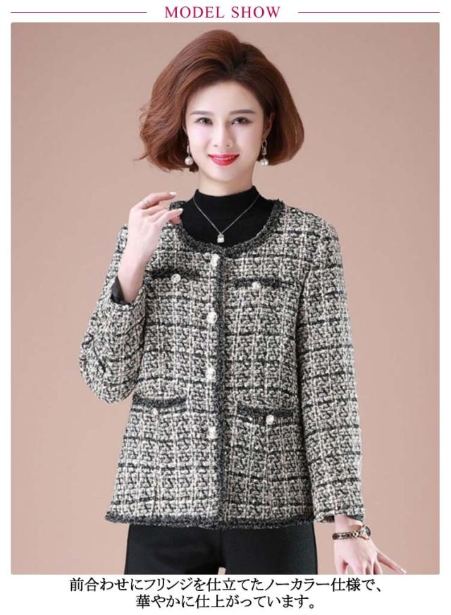 | 中綿と薄手ありが選べる!ノーカラーツイードジャケット♪ 前合わせにフリンジを仕立てたノーカラー仕様で、華やかに仕上がっています。 袖口や首元から裾に施されたフリンジが華やかさをプラス フォーマルでもカジュアルでも使える上品なデザイン!上品でワンランク上の大人女性に大変身!! パーティーや結婚式、懇談会、授業参観、オフィスなど幅広く着こなせるアイテムです♪ | |
