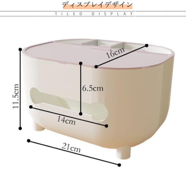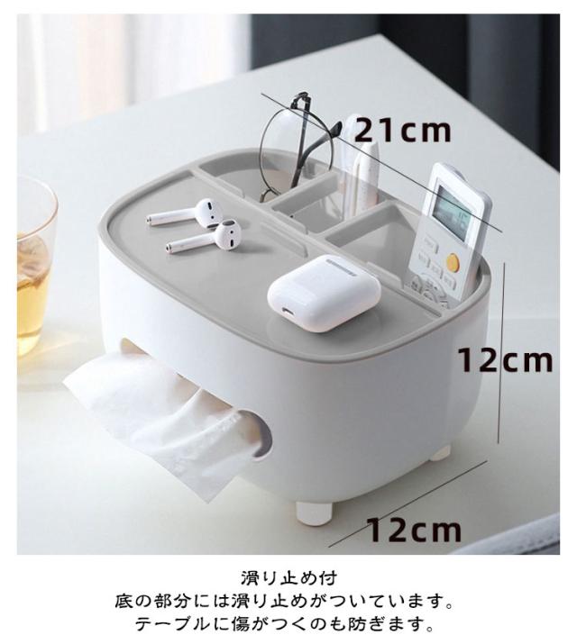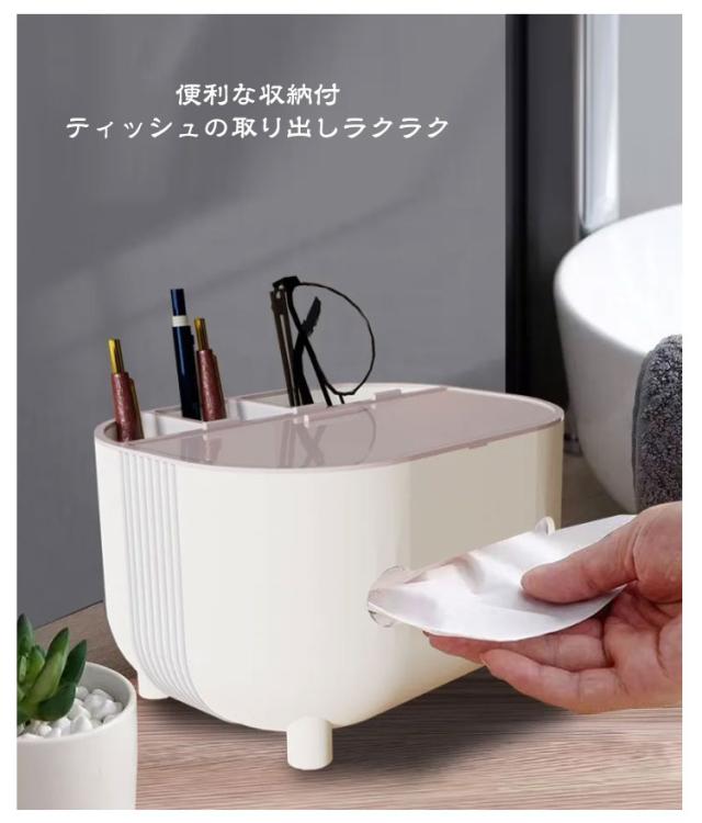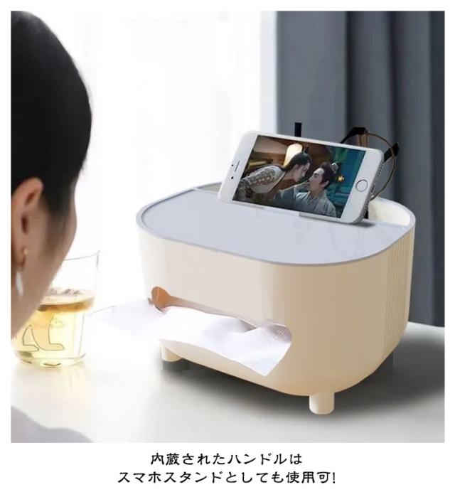 | おしゃれでかわいい 収納付き多機能ティッシュケース テーブル周りの小物が収納できてすっきり片付く、 リモコンが収納できるティッシュケース リモコンラックや小物入れにもなる収納付き、多機能ティッシュケース。 ふた付きのおしゃれで便利なティッシュボックスです。 ●シンプルかつ素朴なカラーで どこに置いてもなじみます ・デスク デスク周りの差し色としても スルーはピッタリ! ・ドレッサー 化粧台に置けば 化粧道具を置くのにピッタリ ・寝室 ベッドサイドに置けば スマホスタンドにも◎ ●便利な収納付 ティッシュの取り出しラクラク ●内蔵されたハンドルは スマホスタンドとしても使用可! ●落下耐性 しっかりした作りで 丈夫で長持ち! ●滑り止め付 底の部分には滑り止めがついています。 テーブルに傷がつくのも防ぎます。 | |