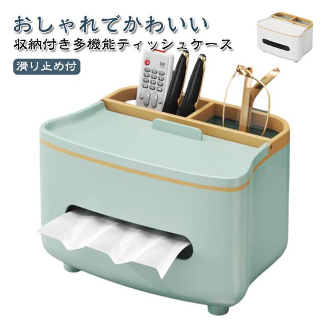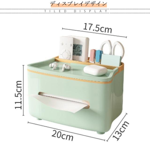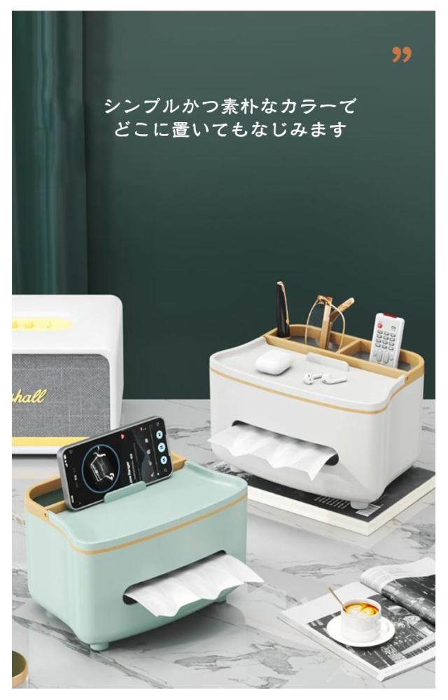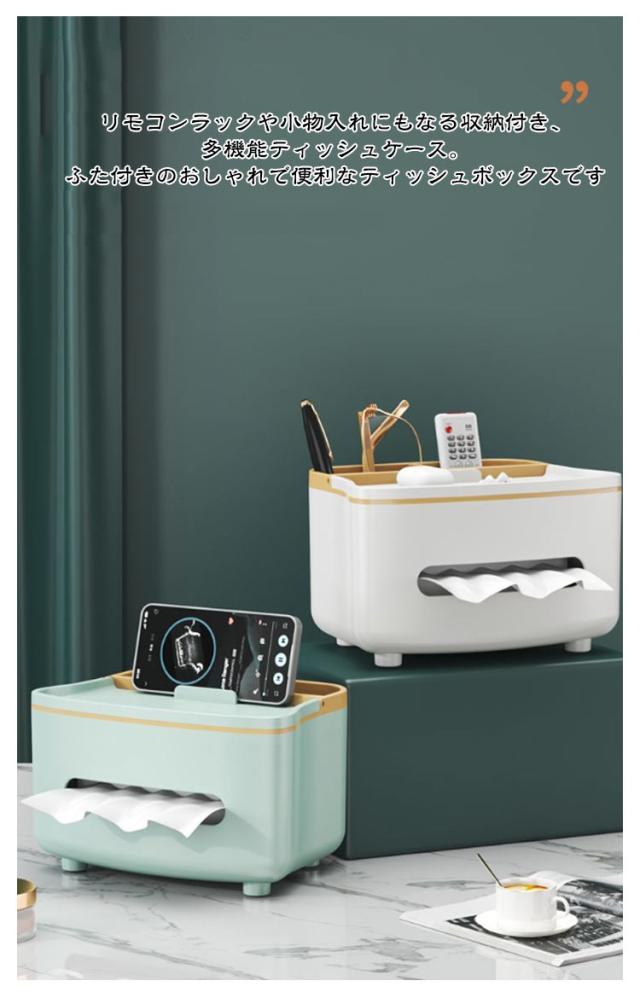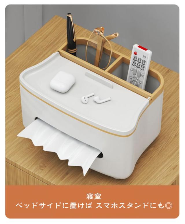 | おしゃれでかわいい 収納付き多機能ティッシュケース テーブル周りの小物が収納できてすっきり片付く、 リモコンが収納できるティッシュケース リモコンラックや小物入れにもなる収納付き、多機能ティッシュケース。 ふた付きのおしゃれで便利なティッシュボックスです。 ●シンプルかつ素朴なカラーで どこに置いてもなじみます ・デスク デスク周りの差し色としても スルーはピッタリ! ・ドレッサー 化粧台に置けば 化粧道具を置くのにピッタリ ・寝室 ベッドサイドに置けば スマホスタンドにも◎ ●便利な収納付 ティッシュの取り出しラクラク ●内蔵されたハンドルは スマホスタンドとしても使用可! ●落下耐性 しっかりした作りで 丈夫で長持ち! ●滑り止め付 底の部分には滑り止めがついています。 テーブルに傷がつくのも防ぎます。 | |