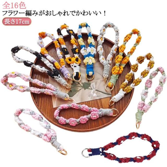 | 全16色 フラワー編みがおしゃれでかわいい! 付属しているクリアプレートをスマホケースに挟んでフラワーストラップを付けるだけ。 | |