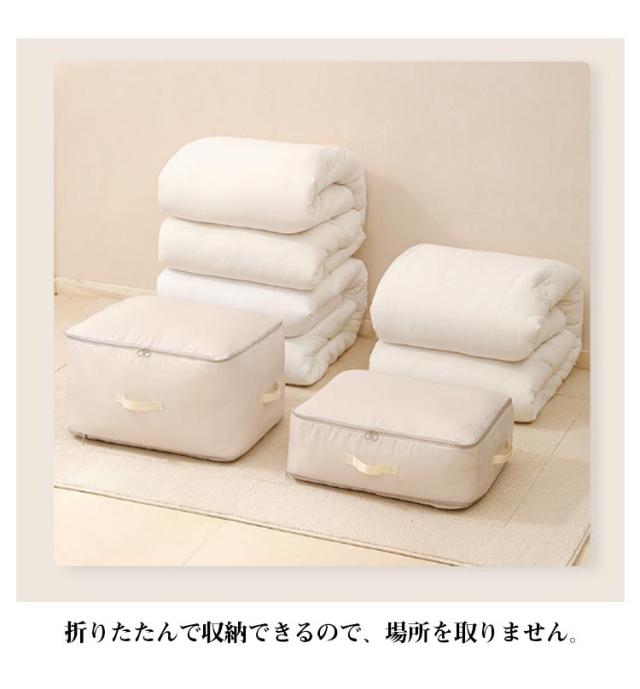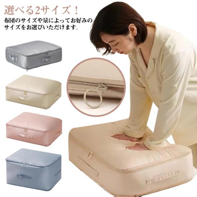 | 選べる2サイズ!布団のサイズや量によってお好みのサイズをお選びいただけます。 ファスナーを閉めるだけで簡単に圧縮可能!約40%のスペースを節約できます。 ファスナーを全開にできるので、物を出し入れしやすいです。 取手がついているため、縦置きでも横置きでも取り出しやすいです。 折りたたんで収納できるので、場所を取りません。 | |