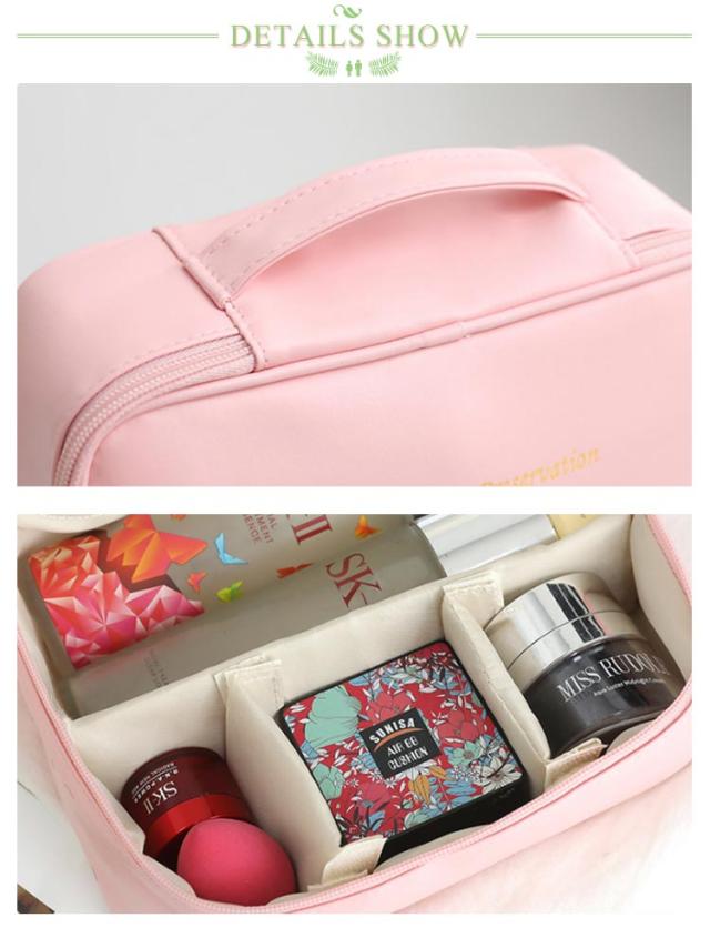 | コンパクトで持ち運びやすい設計 軽量かつ小型のデザインで、旅行や外出先でも手軽に持ち運び可能。ハンドル付きで移動もスムーズです。 大容量で整理整頓が簡単 多層式の収納スペースがあり、化粧品、スキンケア用品、小物などを効率的に収納できます。散らかる心配がありません。 耐久性の高い高品質素材 外側は防水・防汚加工が施されており、傷や汚れに強い素材で長期間使用しても綺麗さを保てます。 おしゃれで上品なデザイン シンプルで洗練されたデザインが特徴。どんな場面でも使いやすく、インテリアとしても映えます。 ファスナー付きで安心の使いやすさ ファスナー仕様で中身が飛び出す心配がなく、しっかりと収納を保護。日常使いから旅行まで安心して使えます。 | |