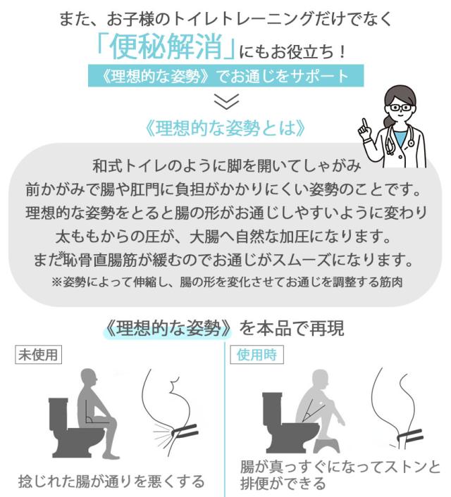 和式トイレのように脚を開いてしやがみ前かがみで腸や肛門に負担がかかりにくい姿勢をとると腸の形がお通じしやすいように変わり太ももからの圧が、大腸へ自然な加圧になります。また恥骨直腸筋が緩むのでお通じがスム-ズになります。