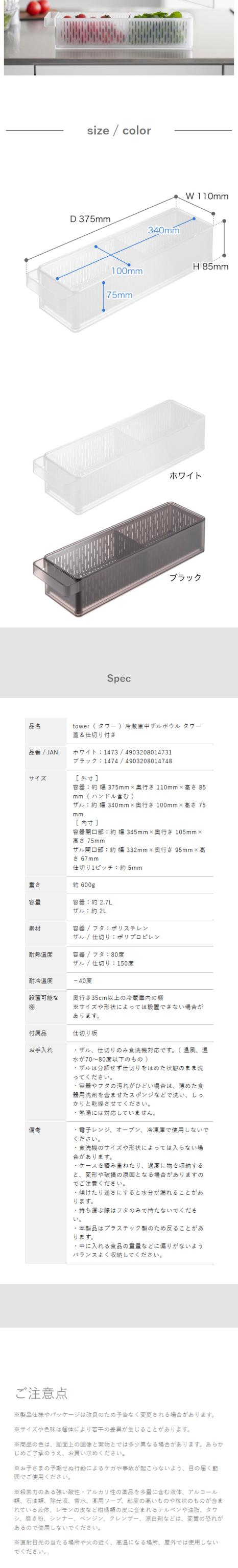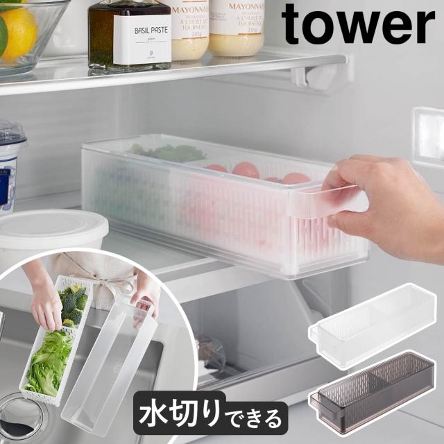 [ 冷蔵庫中ザルボウル タワー 蓋&仕切り付き ]山崎実業 tower 冷蔵庫収納 野菜水切り 野菜 保存容器 冷蔵庫整理 キッチン収納 冷蔵庫用ケース 野菜ストッカー 蓋付き おしゃれ yamazaki 公式 ブラック ホワイト 1473 1474