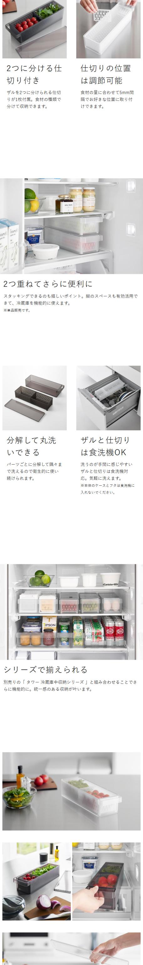 野菜を洗って水切りできて 冷蔵庫に収めやすい保存容器 スッキリ並べて積み重ねられる「 tower 冷蔵庫中収納シリーズ 」の『 tower( タワー )冷蔵庫中ザルボウル 蓋&仕切り付き 』。野菜や果物を洗って水切りできるうえ、フタをしてそのまま冷蔵保存もできるザル付き食品保存容器です。庫内の奥行き35cm以上の冷蔵庫対応で、奥まで無駄なく使える長方形。ハンドルで引き出しやすいのも◎です。ザルを2分割できる仕切り付きで、ザルと仕切りは食洗機対応。キッチン作業がはかどる一石二鳥の保存ケースです。