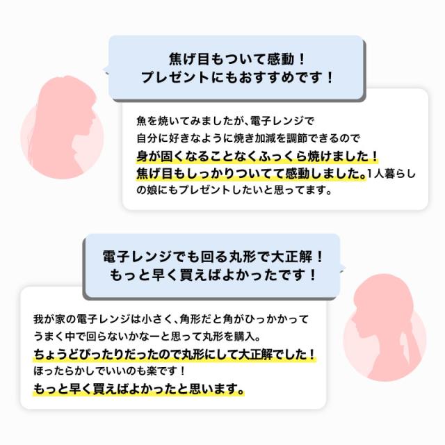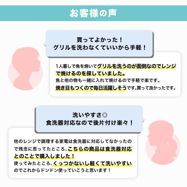 - 今までグリルで焼いていた魚がこんなに簡単に焼ける事に驚きました。ちゃんと焦げ目もついて後片付けも楽でとても満足しています。