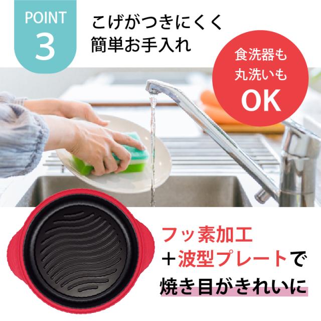 ・レンジで簡単、安全。火を使わないのにこんがり焼けて美味しく調理。