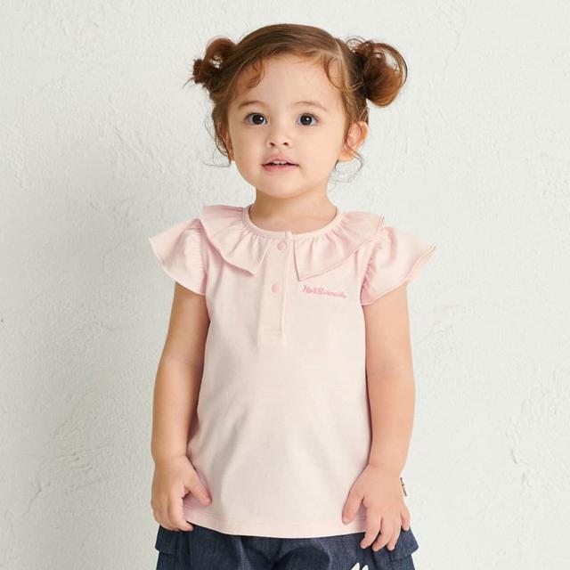 襟や袖口のフリルがかわいらしいデザインのTシャツです。