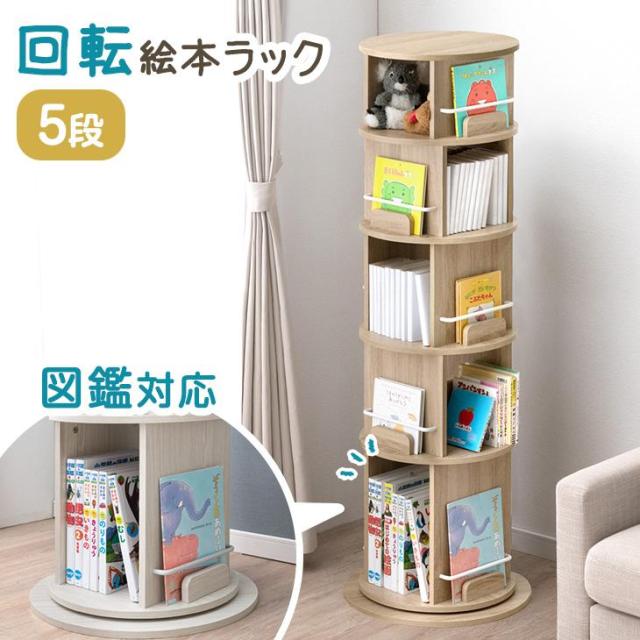 <倒れにくい土台+8cm> 回転絵本ラック 5段 図鑑対応 絵本棚 収納 本棚 回転本棚 絵本ラック 回転ラック 回転式本棚 回転 回転式 大容量 子供部屋 子供 子ども こども 子ども用 絵本 本 図鑑 おしゃれ