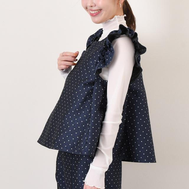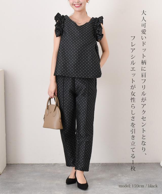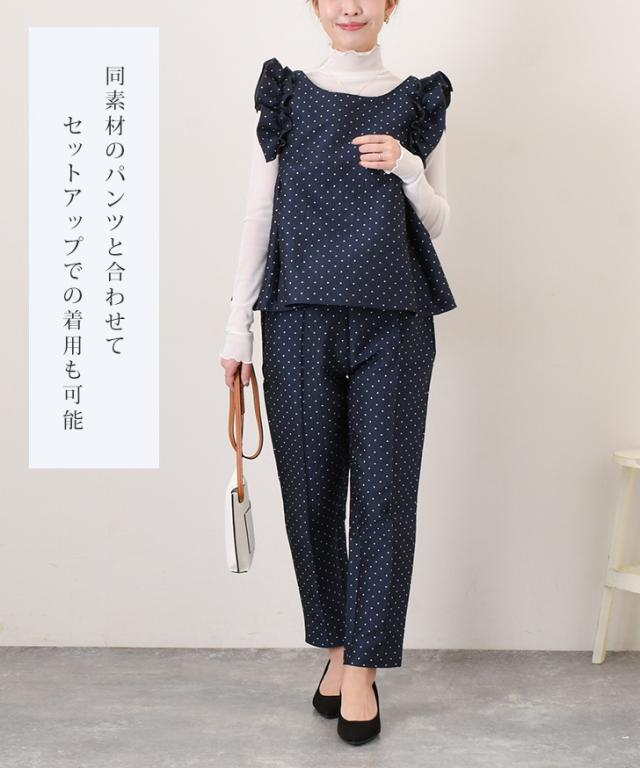 大人可愛いドット柄に肩フリルがアクセントとなり、