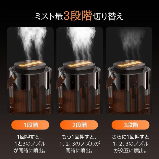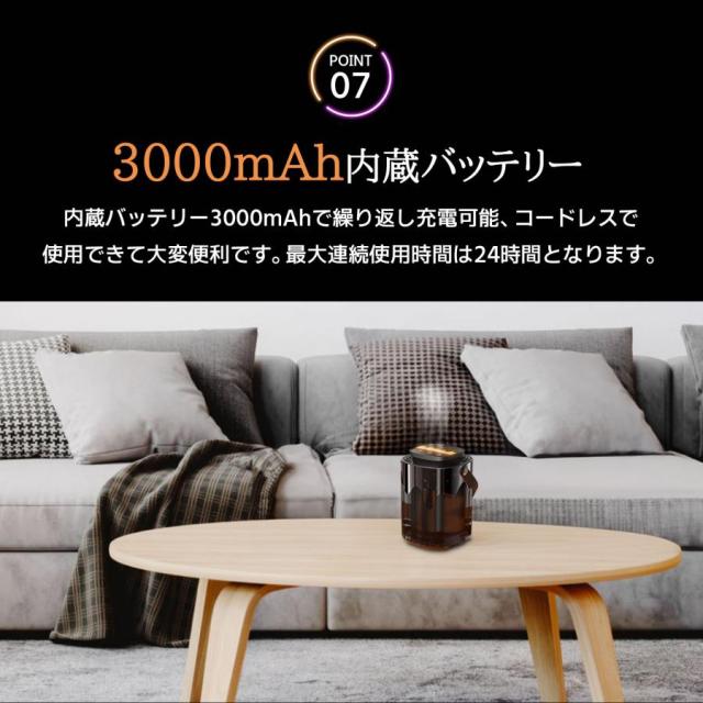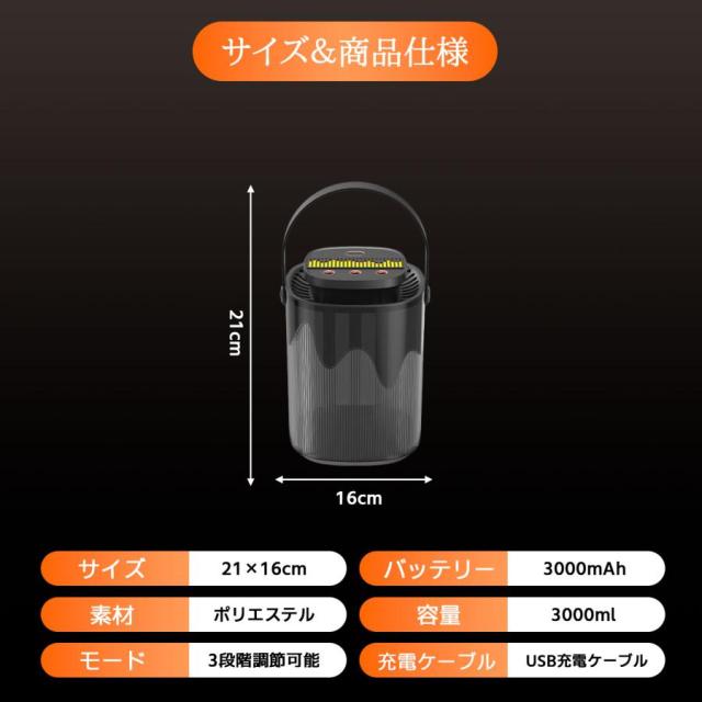| 【内蔵バッテリーで持ち運び自由】 | 3000mAhバッテリー搭載コードレスで場所を選ばず使用可能3方向ミスト噴射で効率的な加湿自由な設置場所に対応 |