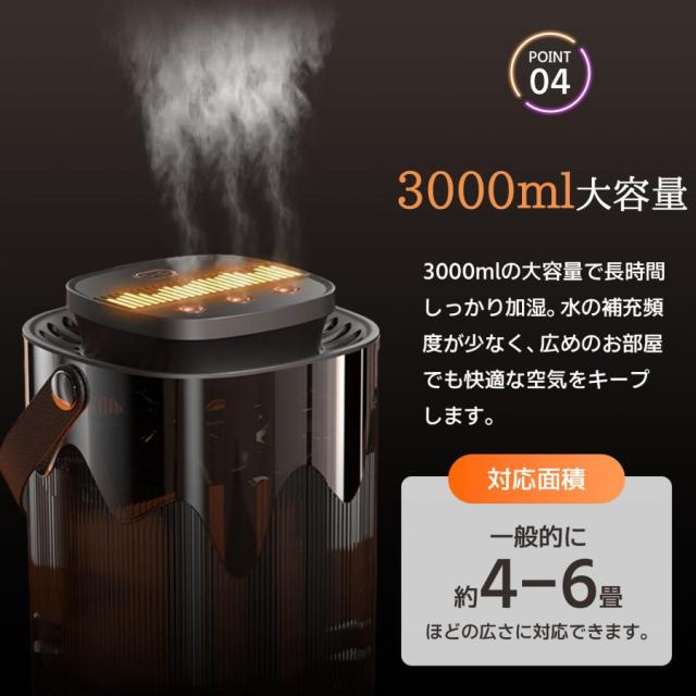 | 【大容量3Lタンク&24時間連続運転】 | 1回の給水で最大24時間使用可能3Lの大容量タンクで給水の手間を軽減朝から夜まで途切れない潤い快適湿度を長時間維持 |