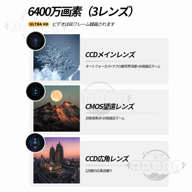 【2025新品】カメラ デジタルカメラ 4K 6400万画素 スリーショット 望遠レンズ 広角レンズ ガラスの裏蓋 オートフォーカス 3inch タッチスクリーン 音楽再生 MP3 MP4 録音 コンピューターカメラ スマートフォン