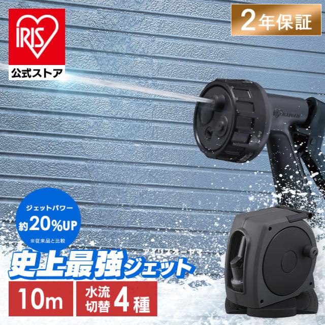(検索用:ホースリール・散水ホース・10m・フルカバー・高圧・ジェット・洗車ホース・掃除・おしゃれ・伸びるホース・4水形・散水ノズル・ベランダ・庭・コンパクト・4967576773621・アイリスオーヤマ)