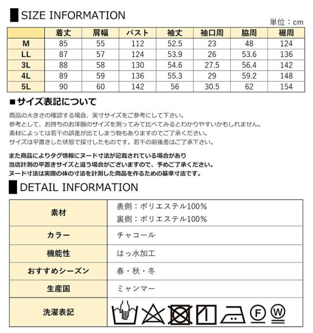 4L:着丈89 肩幅59 バスト136 袖丈55.3 袖口周29 脇周59.2 裾周148