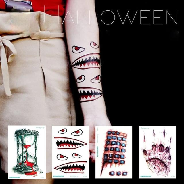 電卓のボタンやファスナージッパー、切れ目から覗く顔やスパイダー、骨、タイガーシャーク、ドクロ、眼、ロボットのような人間、砂時計、ブイサインをするスカル、蠍やコブラ、カミソリやガイコツの手、ピストンやリボン、文字やクマの爪など面白いデザインや不気味なデザインなどおしゃれな入れ墨偽物の刺青シール。